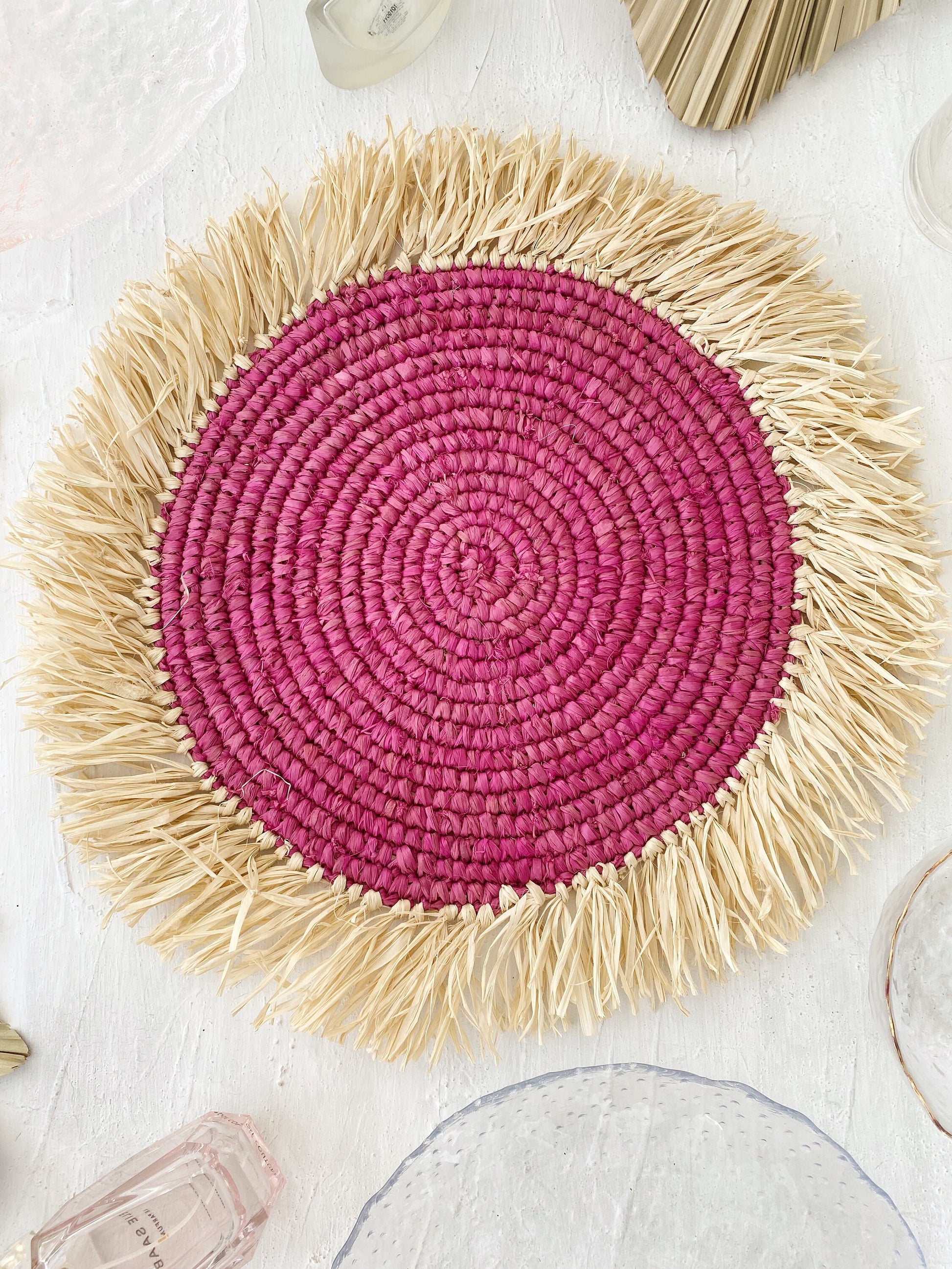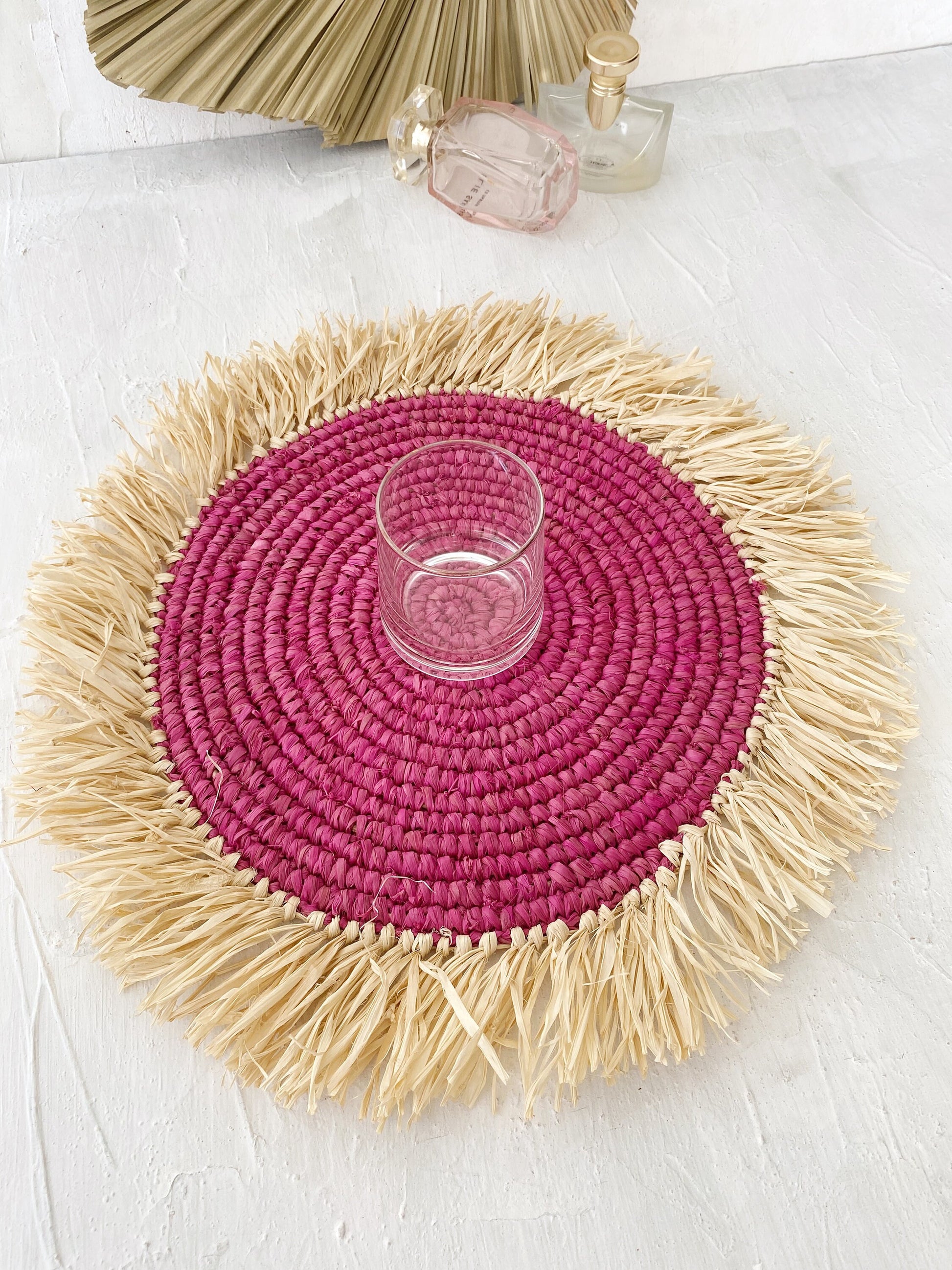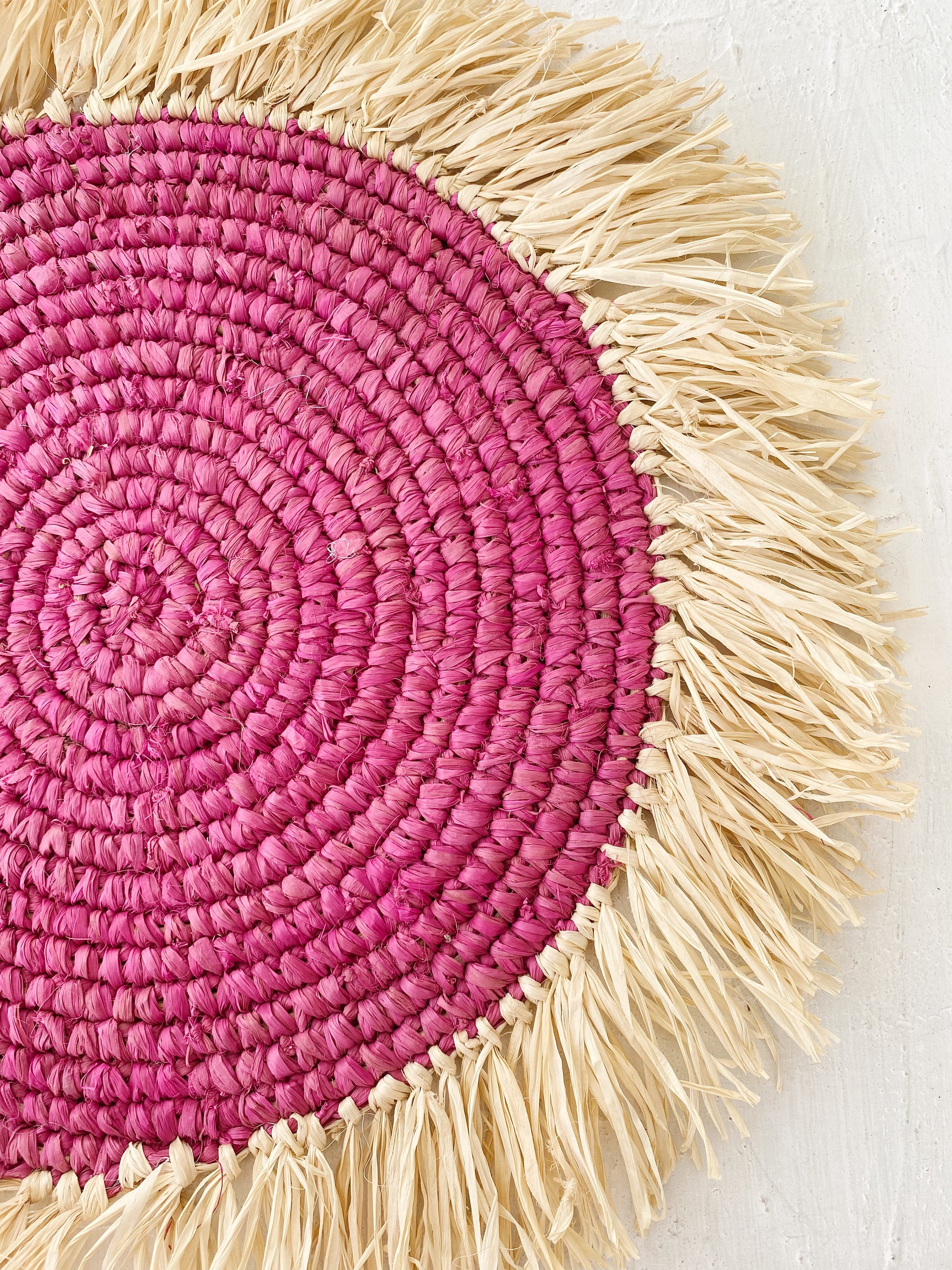 #Round Placemat, Fuschia Natural Placemats, Boho Placemats, Fringe Placemats,Raffia Placemats & Table Charger,Placemats for Round Table,Handwoven Placemats, Woven Braided Tablemats, Natural Coaster, Hand Woven Placemats, Table decor mats, Wicker Pads, Natural wicker placemats, Mat heat resistant, Braided Tablepad, Decorative hanging wall, Hanging wall decoration, Home Decor, Wall basket, Natural Wall Art, Boho Wall Decor, Rustic Placemat, Event Placemats, Raffia placemats, Braided Table Center, Bali Table Heater