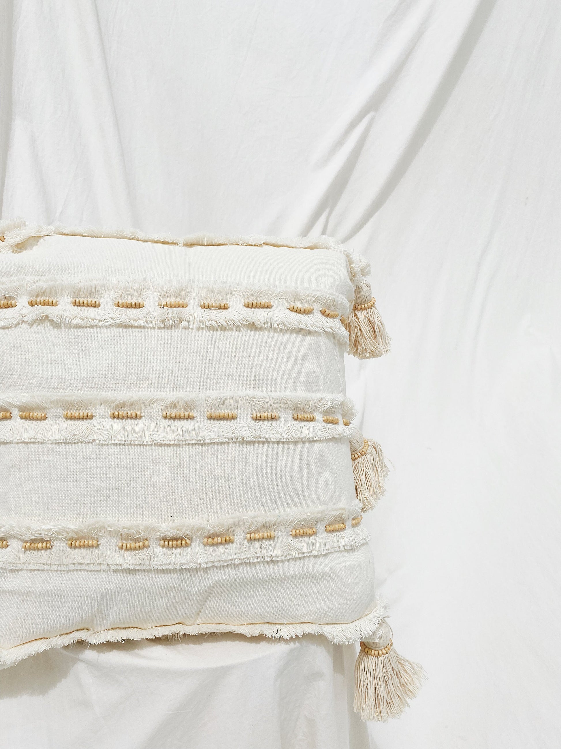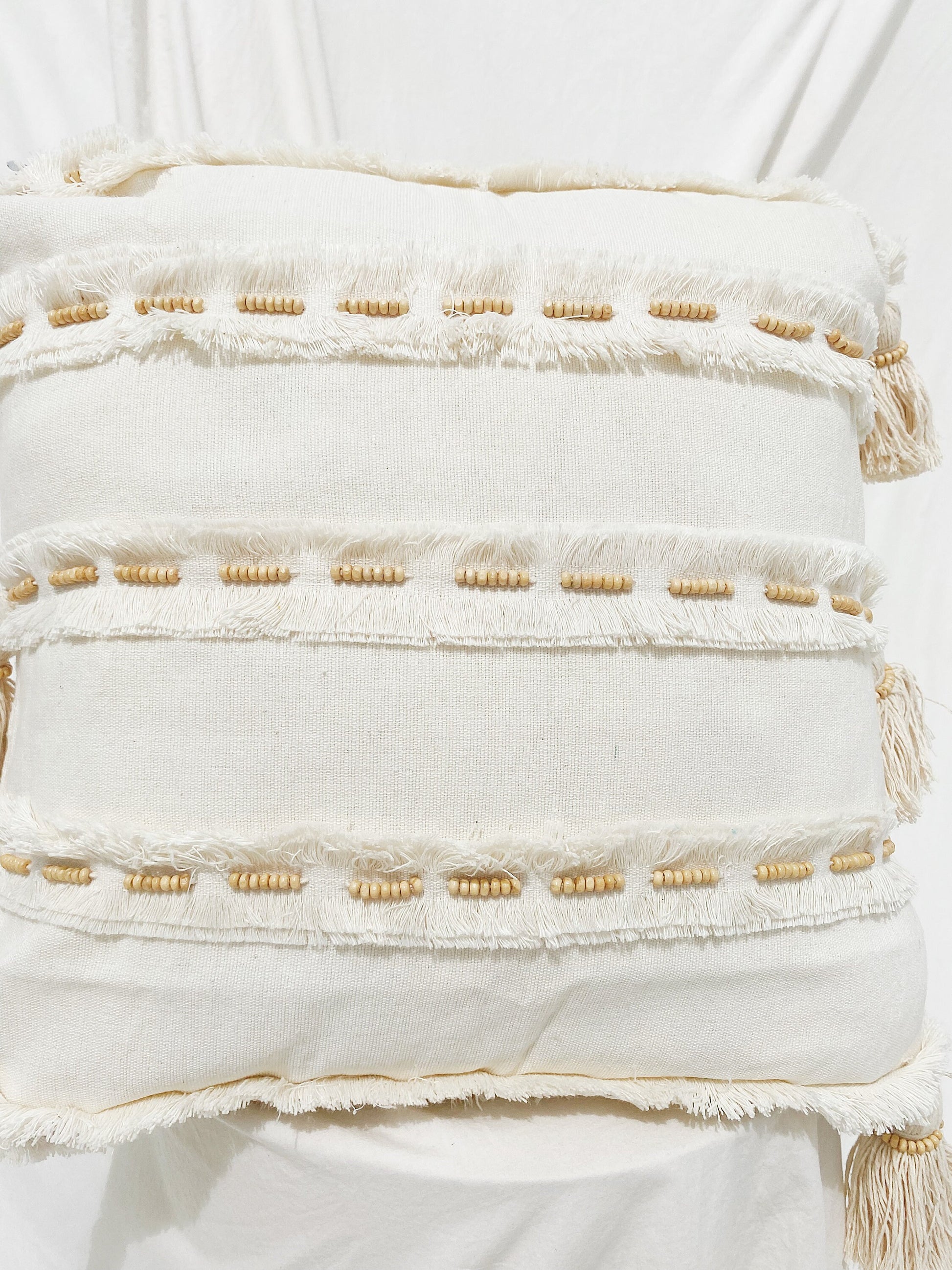 Natural Hand Stitched Cushion Cover with Hidden Zipper ( Without Pillow Inside ) made from 100% Natural Cotton, Wooden Beads, and Hand Stitched technique.