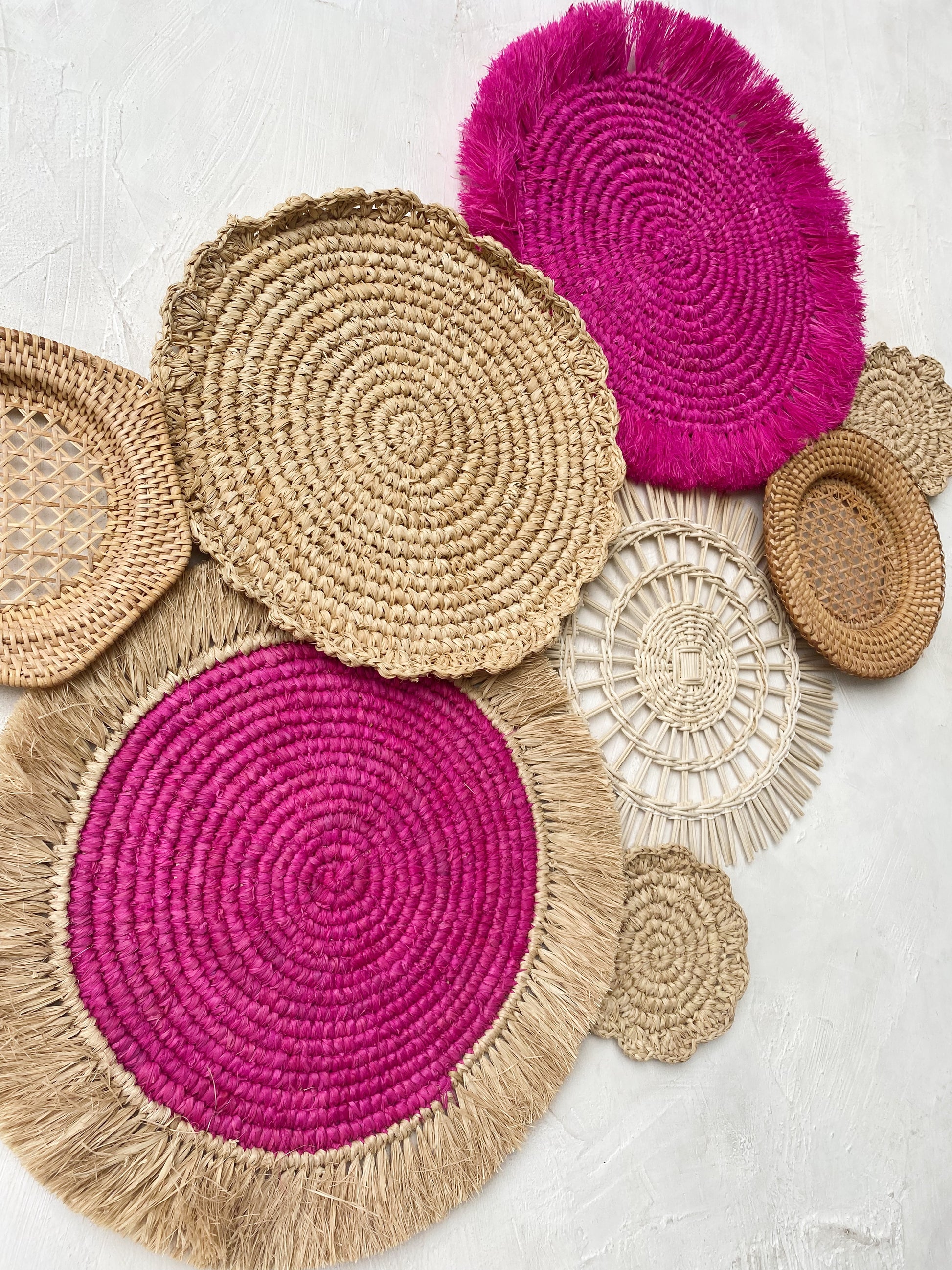 Boho Wall Decor and Wall Basket Set made from Various Natural material. Feature with hand woven with fuchsia colors.